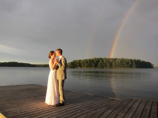 Bröllopet var verkligen helt fantastiskt vackert. Jag är så otroligt lycklig över att jag kunde vara med! Det var en lagom stor tillställning på en fantastiskt vacker plats och hela naturen tycktes delaktig. Först duggregnade det lite under själva vigseln som hölls ute på bryggan, men absolut inte så pass att det störde och det var varmt och milt i luften. Under bröllopsbuffén så regnade det rejält men då satt vi i ett partytält och myste medan regnet smattrade mot taket. Efter det sken de upp, solen tittade fram och himlen lystes upp av en stark och strålande regnbåge. Magiskt. Då tog brudparet tillfället i akt att dansa vals ute på bryggan. Så vackert!