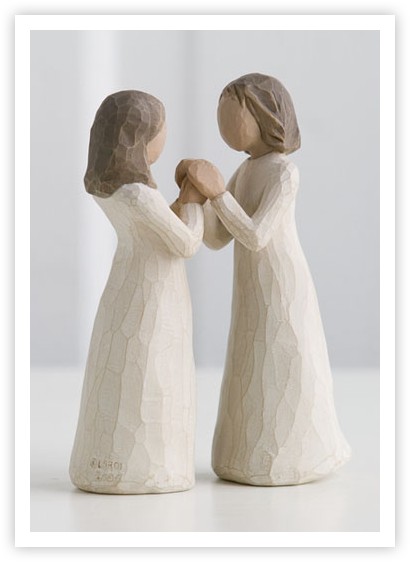 Den som jag ville ge till Emelie föreställer två systrar, vända mot varandra. Den heter Sisters By Heart och budskapet är ”Celebrating a treasured friendship of sharing and understanding”. Jag har sökt den och bett mamma att titta i butiker, men vi lyckades inte hitta den någonstans. Så till sist beställde jag den direkt från nätet och fick den skickad till mig från Skene utanför Göteborg. Den var så fin, precis som jag föreställt mig och det är en perfekt påminnelse till Emelie om vad vi har gått genom och vad hon har gjort för mig. Vi delar verkligen allt, även blod.