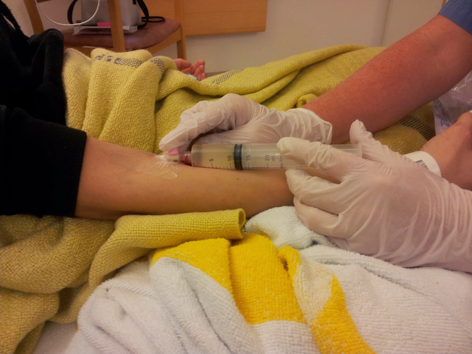 Efter kontrollerna så var det dags för en högkoncentrationsspruta intravenöst. Varken jag eller sköterskan ville dock använda den infarten som satt i armen från igår, den började göra ont och såg ganska oren ut… Så hon satte en ny i andra armen som hon gav kortisonet i och sedan satte hon ytterligare en precis bredvid den första som hon skulle ta blod ur. Men ett sönderstucket finger och tre infarter i båda armarna så kände jag mig inte kaxig vill jag lova…