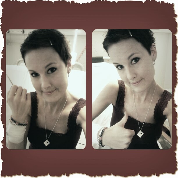| Något avmagrad och trött men håller orken uppe med hjälp av det ”Hanna Stark & Modig”- halsband som jag fått samt båda Fuck Cancer- armbanden. Jag fortsätter kämpa. |