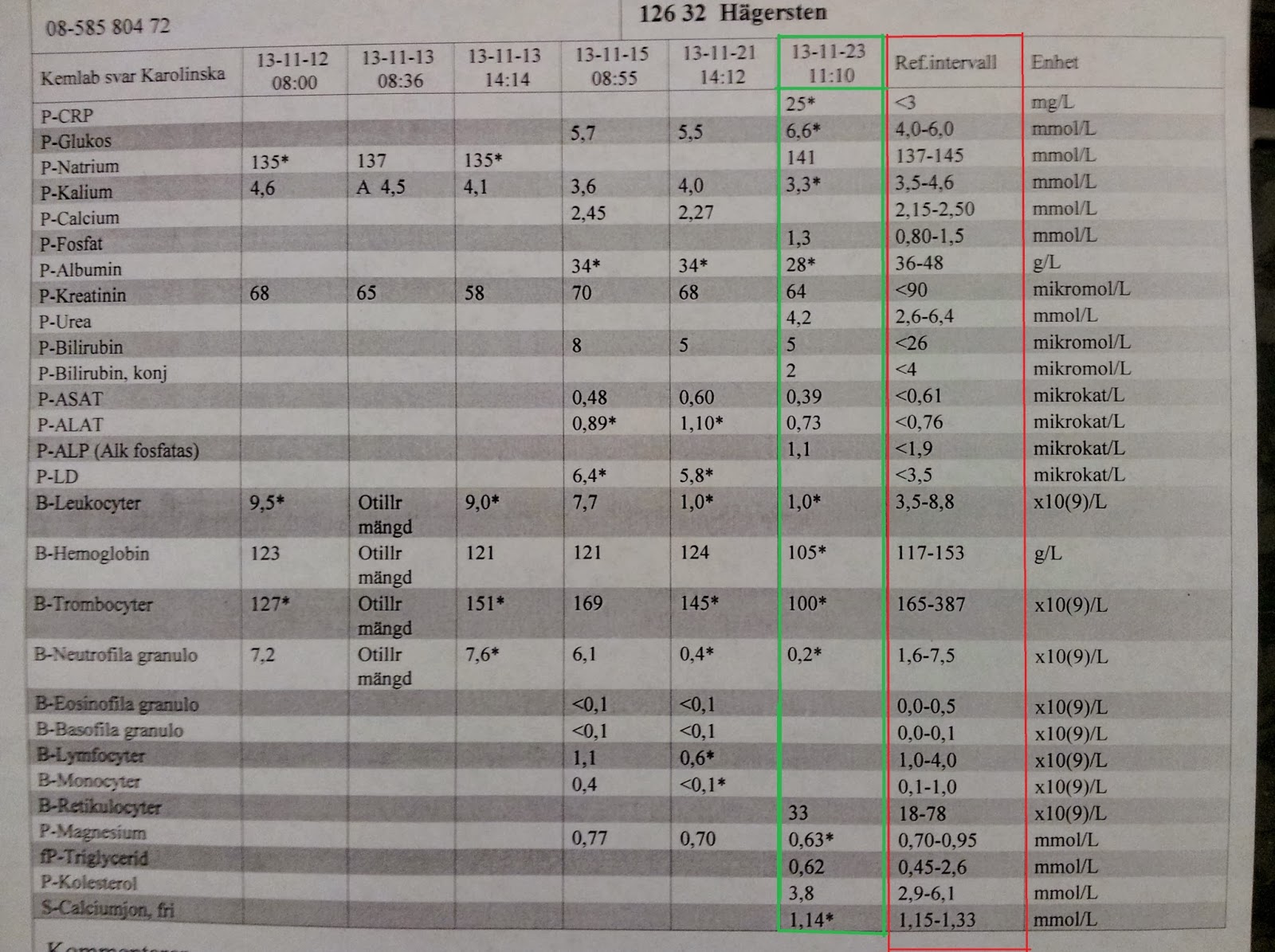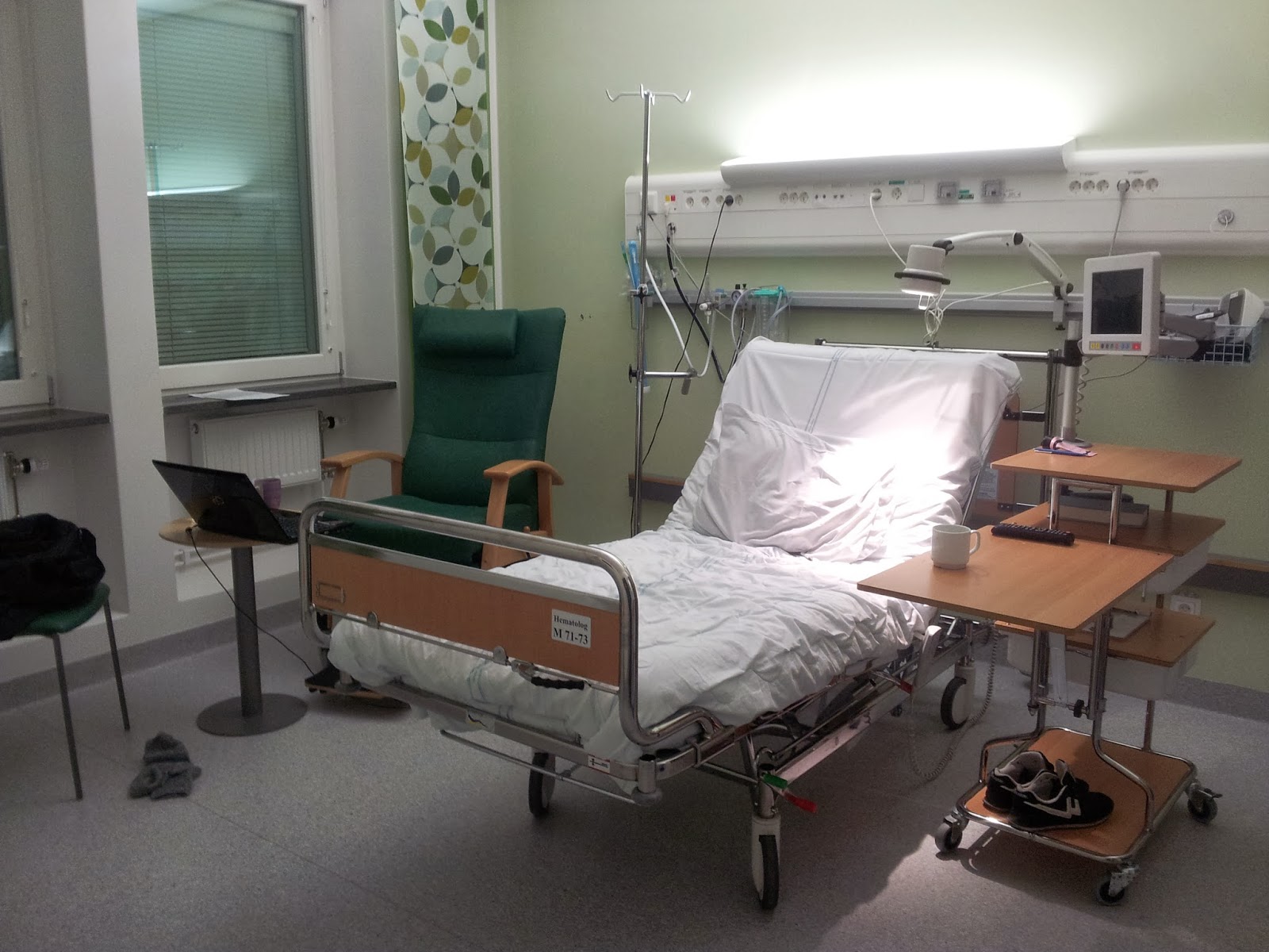 Under natten steg febern igen. Jag vaknade med samma brännande ansikte, huvudvärk och en tilltagande smärta i lederna. Ringde då direkt på en sköterska som tog tempen som visade på 39 grader och sen fick jag Alvedon. Febersvettningar hela natten i kombination med en svidande och brännande mage har gjort att jag inte sovit något vidare. Sedan är jag ju nu återigen tillbaka i rutinen med att sköterskor kommer in i tid och otid för att ta prover, kontroller och ge mediciner, däribland antibiotika tidigt på morgonen.