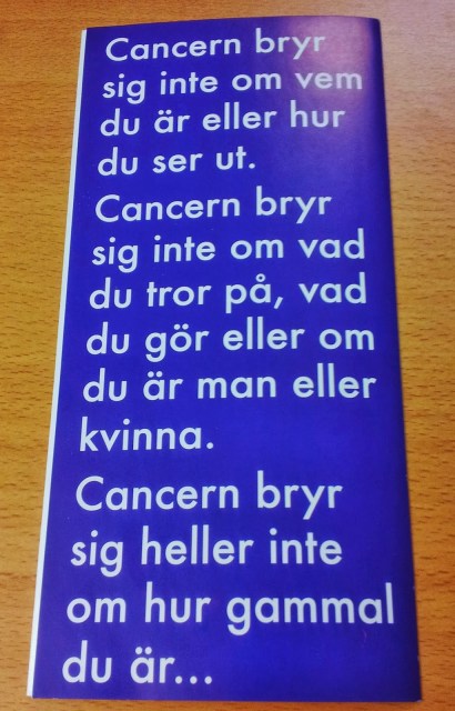 | Baksidan av Ung Cancers broschyr som jag hittade i det lilla patientbiblioteket rakt utanför mitt rum. Smärtsamt men sant… |