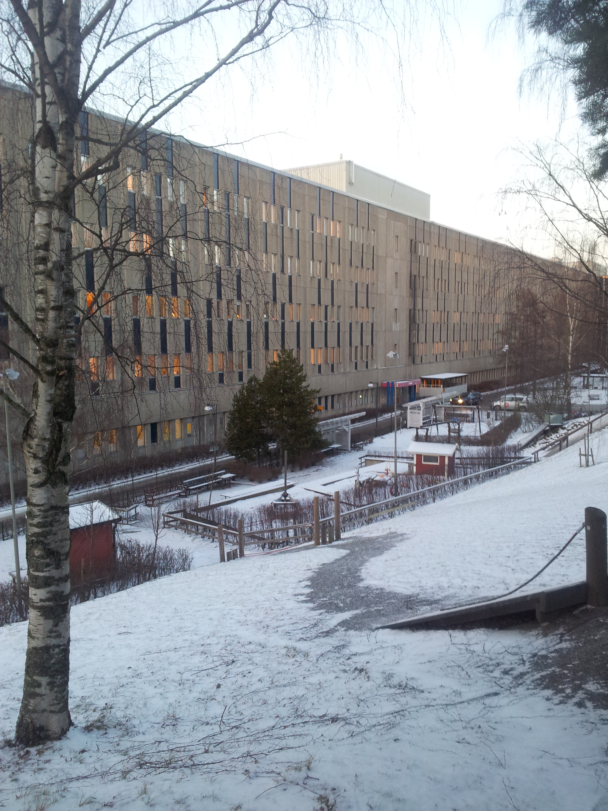 131209 Inlagd och tar promenad runt sjukhuset i Huddinge