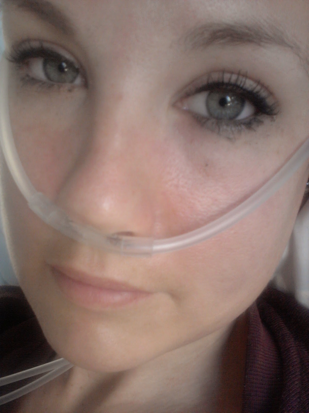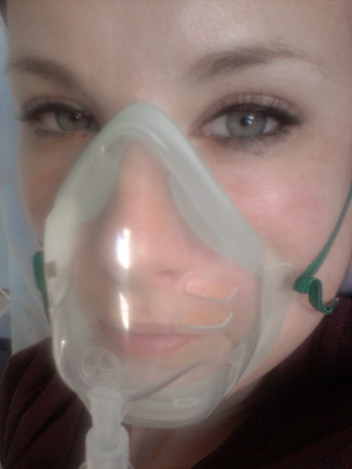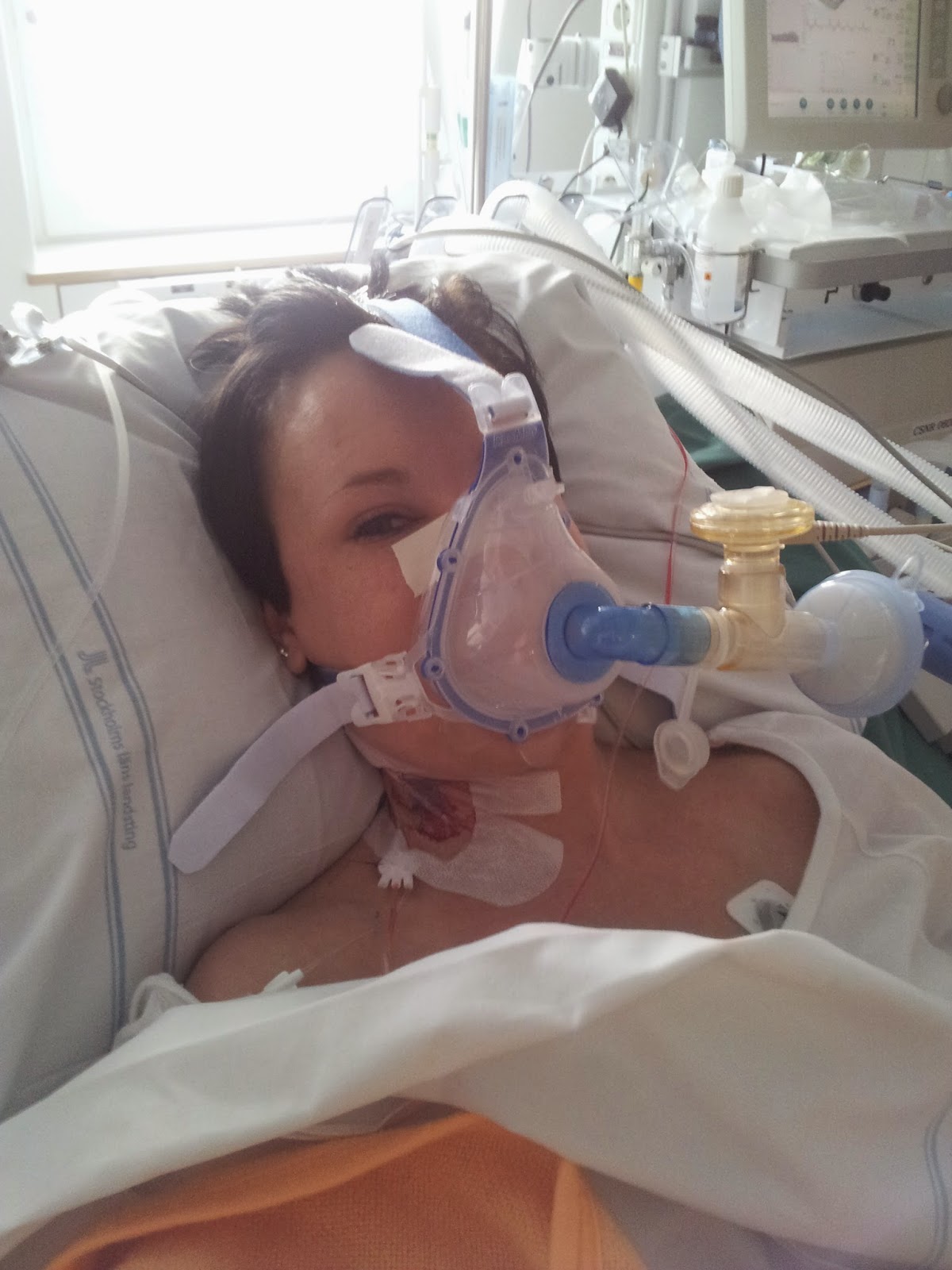 Jag avbröts i mina tankar av en sköterska som sa ”nu sjunker hon ytterligare”. Jag fick en grimma intryckt i näsan som skulle hjälpa mig andas men när sköterskorna och läkaren efter en stund konstaterat att det inte gav mycket till resultat så fick jag en syrgasmask istället.