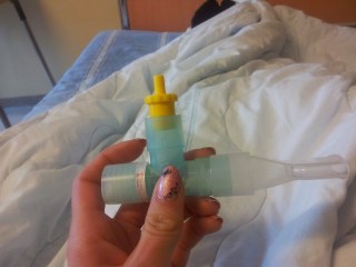 Efter att ha lugnat mig lite så låg vi båda och halvslumrade framför TV:n, jag i min säng med oändliga lägen och han i fåtöljen som han bekvämt lutat bakåt. Sjukgymnasten dök upp igen efter lunch som utlovat och med sig hade hon ett litet instrument. Hon instruerade mig att ta 10 andetag i den varje timme. Den vidgar och ”tvingar” isär lungorna genom att släppa in en mycket större mängd luft än den släpper ut. Ganska svårt och tungt när man inte kan ta ordentliga andetag och dessutom startade den rethostan, men jag kämpade på. Rickard såg till att jag fick in rutinen med den genom att påminna mig en gång i timmen. Klockan blev både 13, 14 och 15. Jag fick två påsar med blod. Ingen läkare syntes till. Vi fick veta att han hade fått ett akutfall så vid 16- tiden var Rickard tvungen att åka igen. Men hans sällskap under dagen hade varit ovärderlig för den bestod av mycket ångest och sorg.