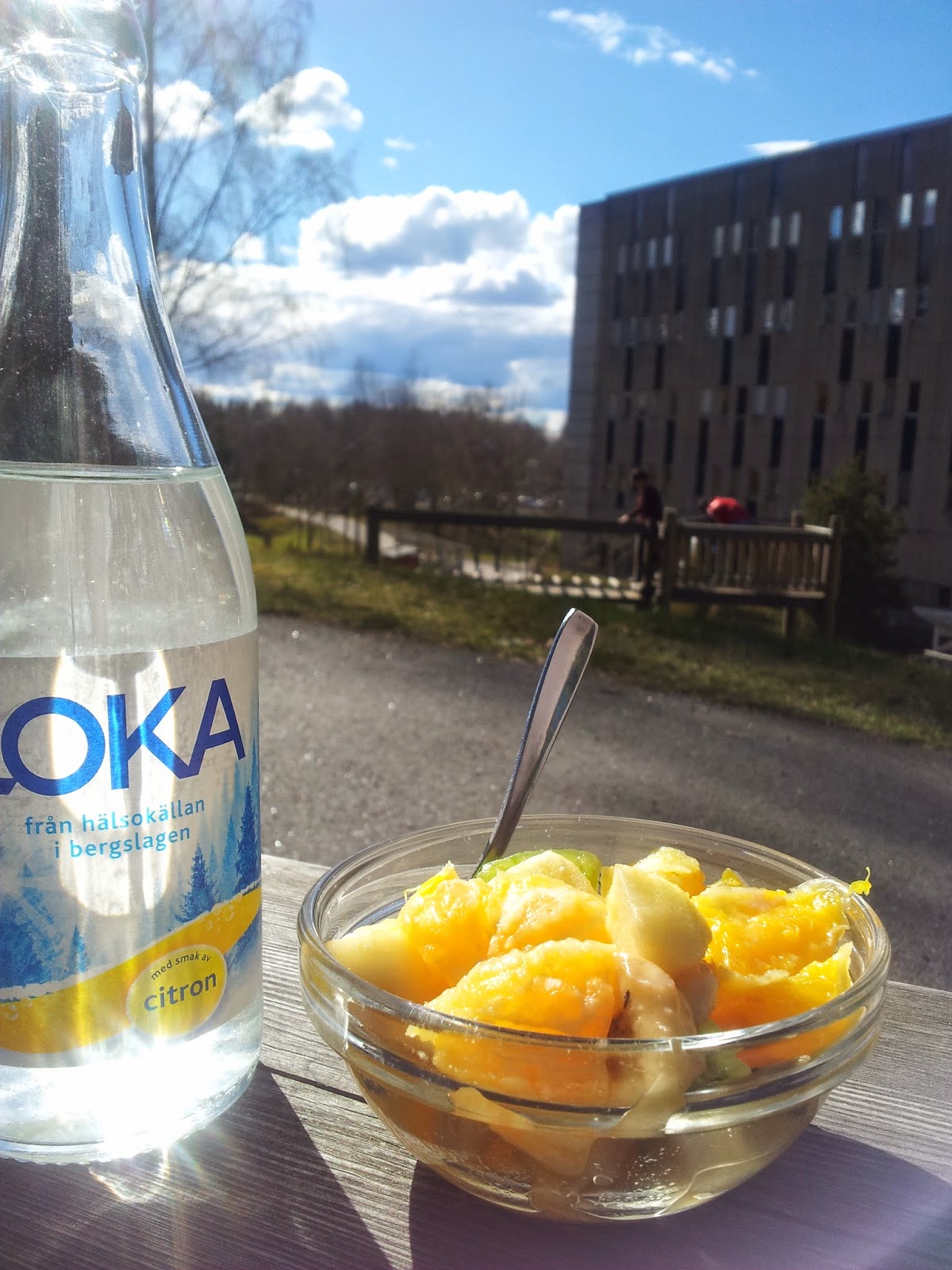 Solen sken och efter lunch kände jag att jag behövde frisk luft. Jag tog en lång promenad medan jag lyssnade på dokumentärer på P1. Behövde annat att tänka på en stund och det var riktigt skönt ute. Jag njöt mer än på länge av fåglarna, solen, alla olika blommor och himlen. När jag kom tillbaka till sjukhuset så var jag inte riktigt redo att gå in än men kände att jag var väldigt törstig. Tog hissen upp till CAST, hämtade min bok och passade på att fråga i köket om jag kunde få med mig en Loka ut. Förutom det så hade dom underbara sköterskorna gjort i ordning en liten skål med fruktsallad och ställt undan åt mig, så den fick jag också med mig ut! På en parkbänk precis utanför B- ingången satt jag sedan i solen med min Loka, fruktsallad och en bra bok. Jag vågar säga att livet kändes ganska så bra just då faktiskt. Tänk vad mycket väldigt lite kan göra.
