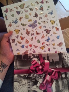 Ytterligare ett kuvert fanns innanför min dörr och väntade på att få muntra upp. Ett stort ett! Jag hann knappt få av mig kappan innan jag hade rivit upp det. Inuti fanns ett kort med en massa fjärilar på. Redan där stannade jag upp och blev tagen. Just fjärilen har jag skrivit om förut. Jag har berättat varför den fått så stor betydelse för mig. Symboliskt står den för ”förnyelse” och ”transformation”. Den som jag har tatuerat in på handleden placerades där av en annan, väldigt känslosam och intim, händelse som jag bara delat med mig av till mina närmaste. Men efter att ha genomgått en transplantation så har den fått en om möjligt ännu starkare innebörd. Den är plötsligt en symbol för min existens och för den gåva jag fått av min lillasyster. Jag fick senare veta att kortet var slumpmässigt utvalt, ödet måste ha pekat på det.