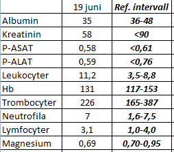 Den här veckans (faktiskt) enda besök på sjukhuset gjorde mig på bra humör! Dessutom fick jag ett trevligt samtal från syster Kerstin under måndagen och hon kunde berätta att alla mina blodvärden är förträffliga. Så himla skönt att höra! Faktum är att om man bara läser av dom så ser jag ut som vilken frisk och pigg människa som helst. Jag kan ärligt talat inte minnas när samtliga värden låg inom ramarna senaste. Till och med levervärdena har stabiliserat sig till en normal nivå nu. Lycka! Detta ska firas.