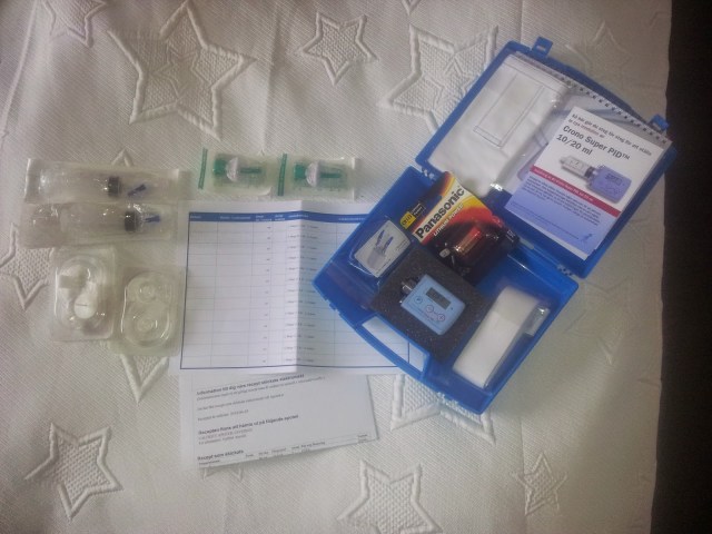 I den blå lådan ligger pumpen och lite reservdelar till den. Sedan är det nålar med slangar, sprutor och små uppdragskanyler kallade ”mini spikes”.