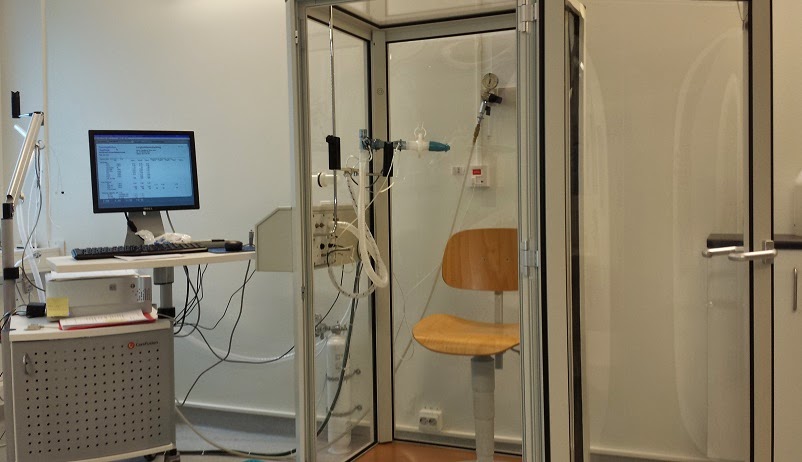 Kan påminna om att man får krypa in i en minimal glaskupa (okej, så rackarns liten kanske den inte är, men för en klaustrofobisk så är den mikroskopisk). Har här lånat en bild från ”Nyckelpigan” – hör av dig om du misstycker! Man får sitta i den och blåsa i slangen efter olika instruktioner. Sedan mäter en kurva hur lungkapaciteten är och hur många liter de rymmer. Den maximala mängd jag utnyttjar är 4,6 liter, men lungorna rymmer mer än så.