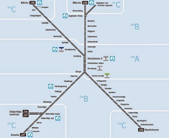Här är linjekartan över pendeltågen så att ni kan se hur galet fel min resa blev i morse.