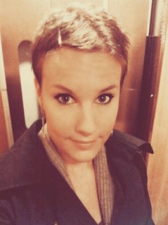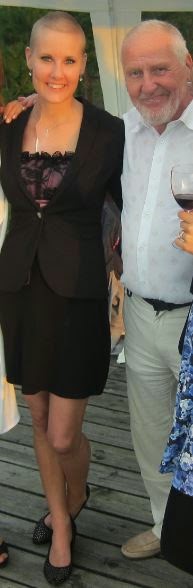 Men bilden här till höger visar i alla fall på ett ungefär hur jag såg ut efteråt, när håret hade börjar växa igen. Det är min far som står bredvid. Just den här dagen var första gången som jag visade mig utomhus utan peruken. Med påmålade ögonbryn och lösögonfransar var jag så nervös att jag trodde att jag skulle svimma. Jag hade min naturliga hårfärg ett tag, men tyckte att det såg så tunt ut eftersom jag är så väldigt blond. Dessutom såg jag cancern i ansiktet varje gång jag såg mig i spegeln. Jag behövde ta kontroll över min yta igen. Så jag färgade håret mörkt och har inte ångrat det en enda sekund.