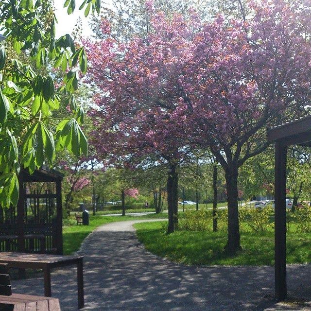 Precis utanför entrén R2 finns en liten lund med fantastiskt vackra träd. Det är några rosa som står i rejäl blom. Ser ut som körsbärsträd, men dom har väl blommat klart nu? Körsbärsträd kanske? Hur som helst så fick jag några fina bilder med mobilen. Fast jag tror i och för sig inte att man kan misslyckas när man fotar något så vackert.