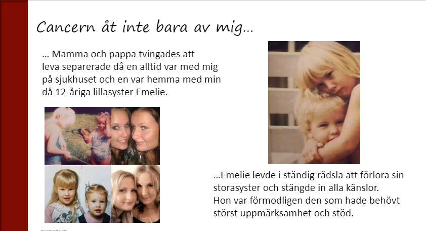 Men det här är en så konstig och påtvingad situation. Oavsett hur emotionell eller känslig jag är för stunden så ska jag gå upp framför en publik och dela med mig av något väldigt intimt, med klar och tydlig röst. Jag har ju dessutom en Power Point- presentation med känsloladdade foton på min kala skalle, min undernärda beniga kropp, min bröstkorg med slangar och mycket annat. De tidigare gångerna så har jag själv undvikit att titta på fotona för att inte få för mycket känslor som stör mitt föredrag. Värst blir det när jag visar sliden med foton på mig och Emelie, både när vi var små och nu som äldre. Samtidigt pratar jag om hur hårt hon drabbades när jag blev sjuk och att hon senare kom att rädda mitt liv med sina celler.