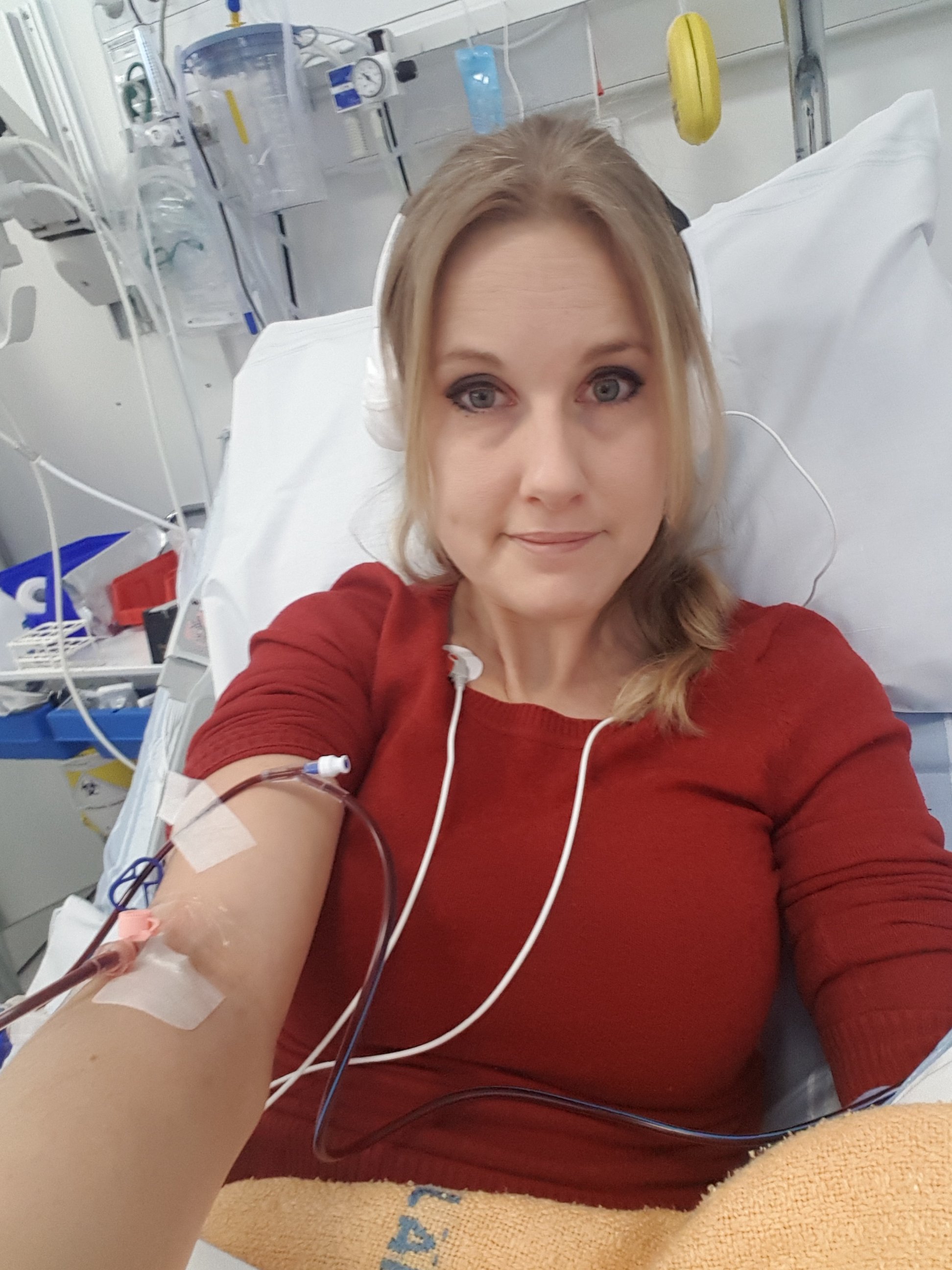 Den nya maskinen får tummen upp! Behandlingen tog bokstavligen bara 92 minuter, men sen får man såklart lägga till tiden det tar att sätta metallnålen, ta prover och låta läkaren lyssna på lunga & hjärta för att kunna ge tummen upp. Och nu hade jag ju turen att ha kanylen kvar från i går så det behövdes inte sättas någon ny kanyl i högerarmen. Men säg att med det inkluderat så tar det 2 timmar. Under de 120 minuterna så hinns det med att göra alla förberedelser, dra ut en hel del blod, tillsätta medicin, sola cellerna med UV- lampor och föra tillbaka det igen. Det är så himla häftigt vad forskningen har gått framåt på kort tid. Jag har fått den här behandlingen närmare 100 ggr och är lika fascinerad fortfarande.