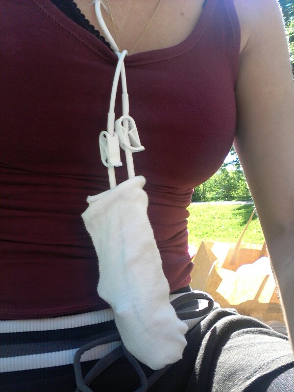<— Fick en liten ”hemmagjord” påse att ha de två långa CVK- sladdarna i idag. Skönt. Dom är i vägen och jättebökiga. Längtar till jag blir av med dom…