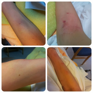 Mina stackars sönderstuckna, blå och svullna armar i morse