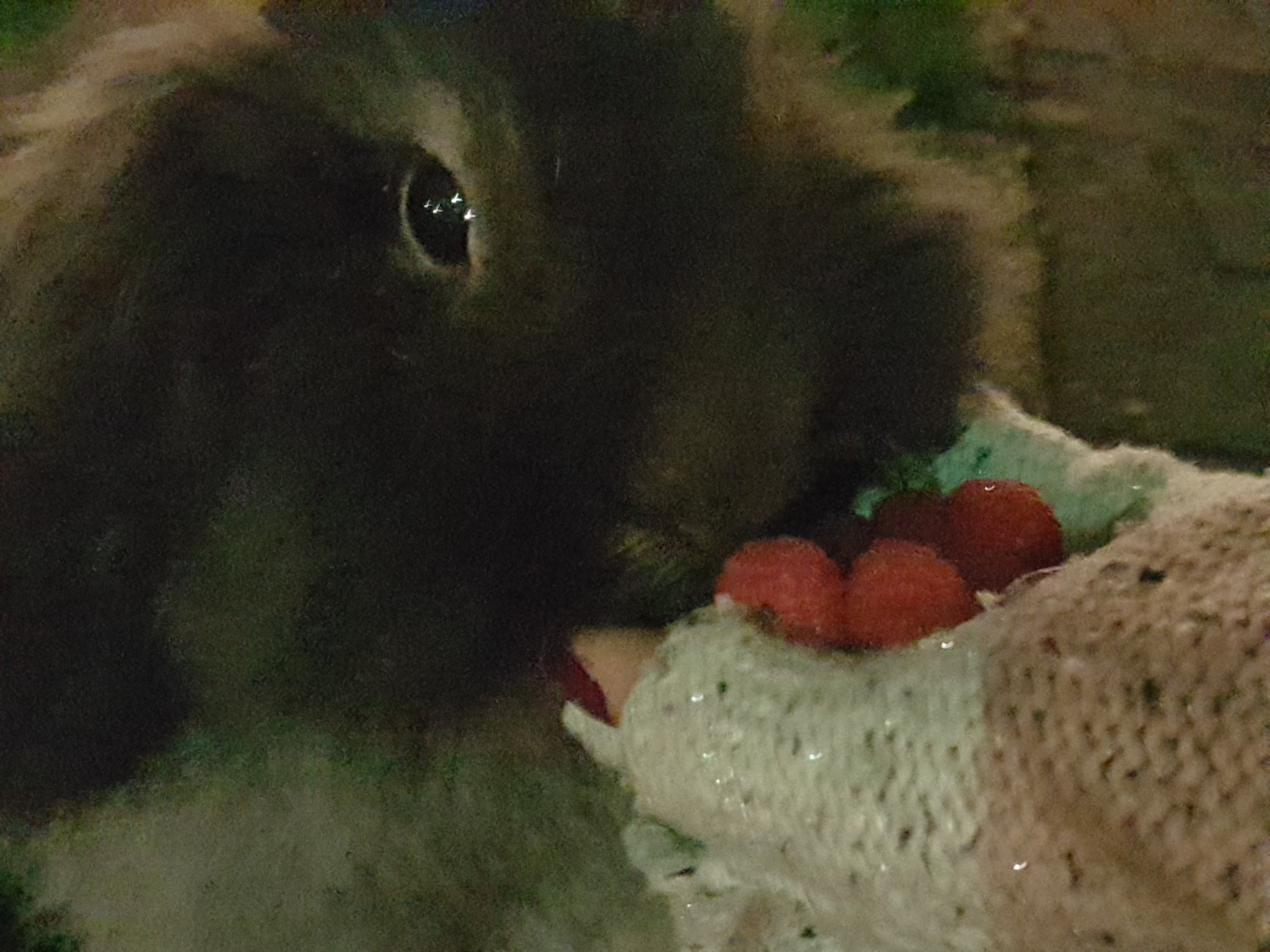Mörk kanin ute i mörkret med en matte som har dålig syn. Bäst att ta det säkra före det osäkra.